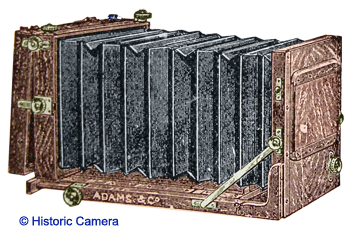 Adams Challenge camera was manufactured by Adams & Company of London England from approximately 1892 to 1932. Constructed of the finest Spanish mahogany with brass hardware. Features included a square leather bellows with reversible back for horizontal and vertical pictures, a rising and falling front, double swing backs, Long and short extension with rear rack and pinion focusing. Available in four sizes, 6 1/2 x 4 3/4 inches, half plate, 12 x 10 inches, and 15 x 12 inches. Prices ranged from £21 to £46.