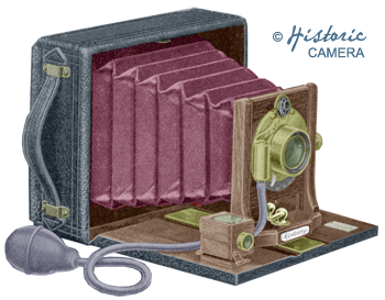 The Century Camera, Model No. 10 was manufactured by the Century Camera Company from approximately 1900 to 1902. Constructed of mahogany with dovetail workmanship and covered in black leather. The brass hardware is highly polished and lacquered. The camera is fitted with a Century rapid rectilinear lens and a Century Automatic No. 3 shutter which operates instantaneous, time and bulb exposures. A reversible finder is provided for vertical or horizontal images. Made in a 4 x 5 inch or a 5 x 7 inch size. Originally priced at $9 and $13 respectively.