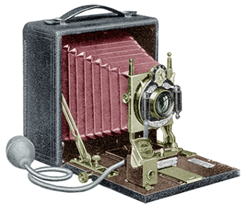 The camera was constructed of solid mahogany box with dovetail joints and covered in fine black leather and a polished mahogany bed, attached with piano hinge for stability. The brass hardware is highly polished and lacquered. The brass front provided a rigid lens mounting with a rising and falling front with an automatic bed clamp. The 5 x 7 model front was made of mahogany wood instead of brass. A reversible back with automatic screen and wooden panel. The camera was fitted with a Century Rapid Symmetrical lens and a Century Regular double Valve, No. 4 shutter. A brass bound, hooded and reversible three lens brilliant finder is provided for vertical or horizontal images. Made in three sizes, 3 1/4 x 4 1/4 inches and a 4 x 5 inch both originally priced at $20.00 or a 5 x 7 inch size originally priced at $27.00.