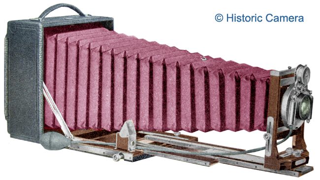 The Century Ultra Grand camera was manufactured by the Century Camera Company in circa 1902. Described as the finest camera in the world, based on the Century Grand Special but without regard for cost. The bellows are a crimson satin, the leather covering is of the finest and all hardware is silver plated. the case is made of sole leather with purple silk velvet lining.The mahogany plate holders are trimmed in silver. Made in three sizes, a 4 x 5 inch originally priced at $125.00 or a 5 x 7 inch size originally priced at $150.00 and an 6 1/2 x 8 1/2 inch originally priced at $200.00.