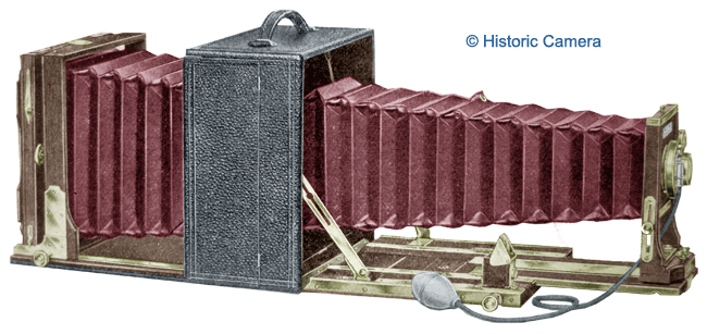 Constructed of mahogany, brass fittings covered in leather. It has rack and pinion movements for rise and fall of front and vertical and horizontal swings an automatic clamp for holding the front board rigid at any desired position on the bed. A drop panel allows ready access to the ground glass and an improved method of adjusting the ground glass making it easy of replacement. Several improvements are also noted in the bellows one being the absence of sharp corners which adds to their durability. The 5 x 7 was originally priced from 108.50 to 131.00 based on lens selection. The 6 1/2 x 8 1/2 was originally priced from 147.50 to 187.00 based on lens selection.