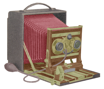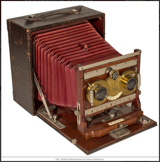 The Century Stereoscopic Cameras were manufactured from 1900 to approximately 1906. Several models were introduced with slight variations, mainly lens and shutter combinations. Constructed of solid mahogany with dovetail workmanship and covered in fine black leather. Polished mahogany bed with piano hinge for stability. The brass hardware is highly polished and lacquered. This high quality made camera featured duel rack and pinion focusing with a long extension bellows, and a rising and falling front. The regular models were originally fitted with a matched pair of Century Rapid Symmetrical lenses and specially designed stereoscopic shutter. A regular lens could be fitted for making full sized 5 x 7 pictures. The stereo cameras were originally constructed similarly to the other century cameras using the same model number but called stereo cnetury. The models from circa 1902 included: