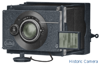 The Bebe Model A camera was manufactured by the Ica A.G. camera company of Dresden, Germany from approximately 1911 to 1925. A miniature camera taking exposures 1 3/4 x 2 3/8 inches on film packs or plates. Constructed of an aluminum body, hardened steel and a leather bellows. It is covered in black fine grain leather, and the metal is finished in black enamel or polished aluminum. It has a strut erecting front, with a direct eye-level finder. A single tripod sockets. It was fitted with ether a Hekla anstigmat F6.8 or a Carl Zeiss Tessar lens F4.5 lens. The shutter was a compound type capable of speed from one to 1/250 of a second, including time, bulb. Fitted with the Hekla lens the camera was priced at $47.50 and with a Carl Zeiss lens it was priced at $71.50. It measured 3 5/8 x 2 3/4 x 1 5/8 inches when closed.