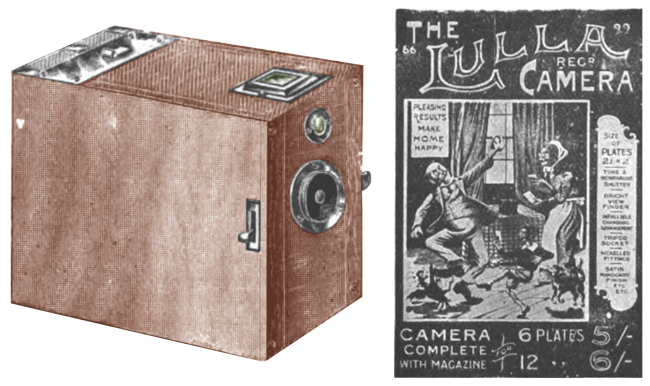 The Lulla camera was manufactured by the Columbia Optical & Camera Company in circa 1901. It was constructed of polished mahogany with nickel fittings. The Lulla was able to capture images 2 x 2 1/2 inches. Photos were described as Lullagrams. Fitted with an everset time and instantaneous shutter, sunk view finder, tripod socket. It was available in two sizes, not for exposure size, but for the plate changing cartridge size of six or twelve plates or films. Originally priced at 5/- and 6/- respectively.