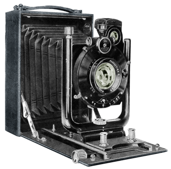 The Ideal model C camera was manufactured by the Ica A.G. camera company of Dresden, Germany in from approximately 1912 to 1927. It was capable of taking 5 x 7 inch exposures on film packs or plates. The Ideal model C camera body was constructed of kiln dried mahogany, ebonized and covered in fine grain leather with a black leather bellows. The front bed is reinforced and the front standard is designed in a a rigid u shaped both made of aluminum. Features include rising and falling front operated by screw adjustments. A double extension track actuated by rack and pinion. An extra large reversible brilliant finder made with a metal mirror and accompanied with a spirit level, and three tripod sockets. This camera was sold with several lens options including a Helka Anastigmat f6.8, a Carl Zeiss Amatar f6.8, Tessar f4.5 or Protar f6.3. The lens were mounted in a Ica compound shutter with speeds from one to 1/250 of a second, including time, bulb. Originally priced at $74.50 for the Hekla lens and $101.00 for the Zeiss. The camera measures 9 x 2 7/8 x 7 inches and weighs 5 pounds.