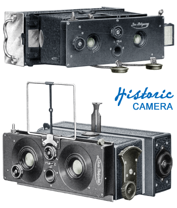 The Polyscope model A camera was manufactured by the Ica A.G. camera company of Dresden, Germany from approximately 1910 to 1927. Several variations were produced during the production. This stereo camera was capable of taking pictures 45 x 107 millimeter pictures on a film pack adapter, a magazine holding twelve plates or a single metal plate holder. Constructed of aluminum with a fixed extension with a screw adjustment for focusing and rising front. A built in brilliant finder is mounted between the lens and later models had an additional eye-level wire view finder. Fitted with a matched pair of Zeiss Tessar lens f4.5 with 2 1/2 inch focus in a compur shutter having speeds up to 1/300 of a second.