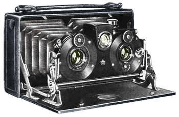 The Cupido Stereoette Camera was manufactured by the Ica A.G. camera company of Dresden, Germany from approximately 1912 to 1927. Capable of producing 1 3/4 x 4 3/16 inch (45 x 107 mm) images on plates, cut film, magazine or film packs. It was constructed of aluminum with the outside covered in the fine grain leather and the exposed hardware wither black enamel or nickel finished. Features include a self erecting front standard that sets and locks the focus to infinity automatically. A focusing lever is provided for closer distance adjustments. Fitted with a an extra large and brilliant finder with spirit level. The back has a large folding focusing hood. It was fitted with a matched pair of Carl Zeiss Tessar f4.5 lenses and the shutter was of the compound type capable of instantaneous exposures up to 1/250th of a second. The camera measures 5 1/2 x 1 1/2 x 3 1/4 inches and weighs 20.5 ounces.