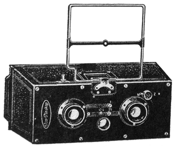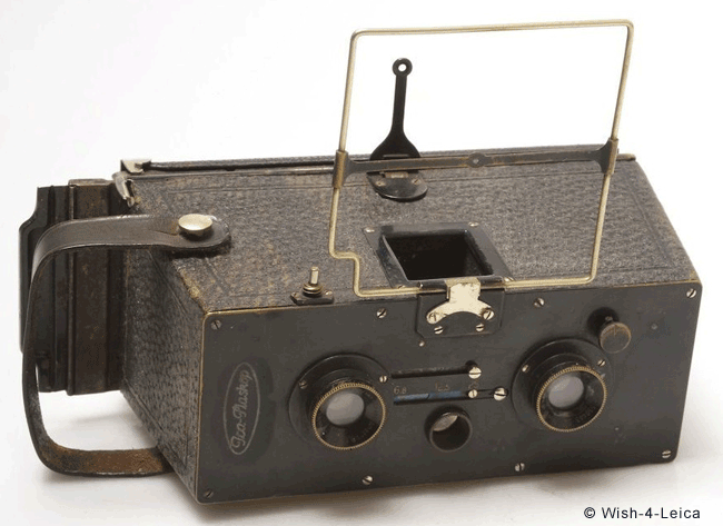 The Plaskop camera was manufactured by the Ica A.G. camera company of Dresden, Germany in circa 1925. An inexpensive and simple stereo camera designed in a rigid trapezoidal box. Constructed of wood with leather covering and black painted metal hardware. Two models were made which were capable of taking exposures 45 by 107 mm or 6 x 13 cm on six individual metal plate holders or film packs. Fitted with a matched pair of Ica Novar anastigmat f6.8 lenses with a 6 cm focal length. The front guillotine shutter provided basic instantaneous and time exposures. Features included a direct view wire finder and a reflex finder.