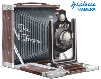The Tropical or Tropica camera was manufactured by the Ica A.G. camera company of Dresden, Germany from approximately 1911 to 1926. A 5 x 7 inch hand camera designed for use in harsh climates. This was accomplished through a the use of constructing the camera body and bed with teak wood and reinforcing all corners and angles with heavy aluminum. No glue was used in the construction. The black leather bellows was chemically processed to withstand the ravages of insects. Features included a rigid, U shaped aluminum front standard with rising, falling and sliding movements operated with two separate screw adjustments. An automatic take up device on the bellows to prevent the bellows from sagging. It is equipped with an extra large brilliant finder that is collapsible, and designed with the Ica indestructible metal mirror. A double extension bellows that extended 16 1/2 inches. A clamp on revolving back with a large folding focusing hood. Two tripod sockets are also included. The Tropical camera was fitted with a Carl Zeiss double Protar F6.8 lens and a compound shutter capable of speed from one to 1/150 of a second, including time, bulb. Capable of accepting either film packs or plates. The camera was originally priced at $180.00. It measured 9 1/4 x 3 3/8 x 8 7/8 inches when closed, and weighed approximately 7 pounds, 14 oz.