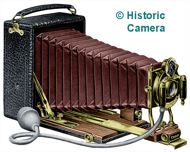 The Petite Century No. 3 was manufactured by the Century Camera Company from 1903 to approximately 1910. Designed as a compact camera with all of the adjustments for a wide field of work. Features included a double extension bellows of sufficient length to use for field work, a double sliding front, a swing bed and swing back, reversible brilliant finder and two tripod sockets. It was fitted with Rapid Symmetrical lens and a no. 1 Automatic shutter. It was available in three sizes, 3 1/4 x 4 1/4 inch, a 3 1/4 x 5 1/2 inch and a 4 x 5 inch size. It accommodated the use of a cartridge roll film, as well as a film pack or glass plate. The ground glass in the rear of the camera provided a full size image for focusing. The camera was constructed of fine mahogany wood handsomely polished and covered in black genuine cowhide leather with a red bellows. The Petite Century No. 3 was priced at $20.00, $25.00 and $25.00 respectively.