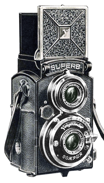 The Superb Reflex Camera was manufactured by Voigtlander & Sohn A.G. from 1933 to approximately 1943. This was a high quality twin lens camera that took regular Browinie no. 2 or no. 117 film for 2 1/4 x 2 1/4 inch exposures. It was fitted with a Skopar f3.5 Anastigmat lens with a three inch focus and mounted in a compur shutter. This baroque designe camera features an automatic tilting finder that aligns with the film picture at all distances, a spirit level is mounted in the groudn glass, the shutter speed and diaphragm settings are visible from the above and changable without tilting the camera, and a special lever device changes film without winding. Priced in 1933 at $89.50.