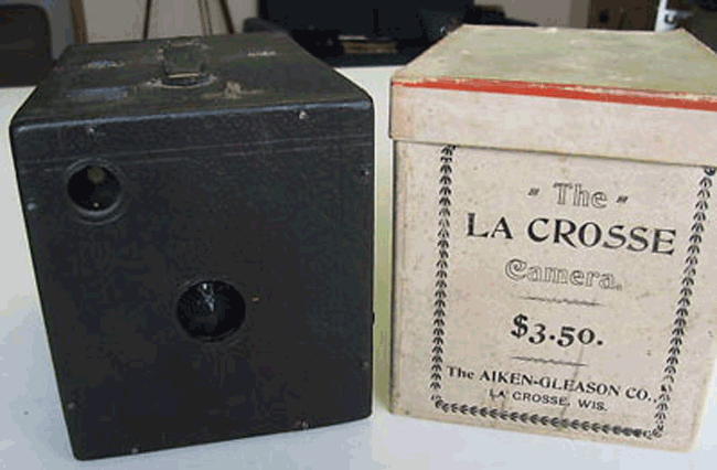 The La Crosse camera was manufactured by the Aiken-Gleason Co. of La Crosse Wisconsin in circa 1897. This camera was made in two sizes, the La Crosse Junior capable of taking 2 1/2 x 21/2 inch exposures and the Senior capable of taking 3 1/2 x 3 1/2 inch exposures. Both camera were constructed of wood and covered in real fine grain leather. Both were equipped with a single achromatic fixed focus lens accompanied with a patent safety shutter providing both time and instantaneous pictures. Additional features included a leather handle, tripod socket and a brilliant view finder. The La Crosse Junior camera was priced at two dollars and fifty cents and the La Crosse Senior at three dollars and fifty cents, almost twice as much as the famous "Cresent", which only sold for two dollars.
