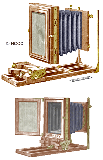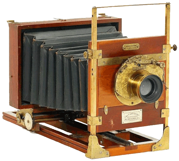 The Novel View Camera was manufactured by E. & H.T. Anthony from approximately 1882 to 1897. The illustration are from for 1884 model. The Novel was constructed with highly polished mahogany, fabric black bellows and both polished and lacquered nickel or brass metal work. This design introduced a novel rotating bellows and rear ground glass that allowed for the adjustment of taking a vertical or horizontal images with the same camera. Additional features included rear focus via push-pull; single or double swing; and rigid bed be using Anthony's patent clips in later models. This camera came in a large variety of sizes including: 4 x 5, 4 1/2 x 61/2, 5 x 8; 6 1/2 x 8 1/2, 8 x 10; 10 x 12, 11 x 14, 14 x 17, 17 x 20, and 18 x 22.