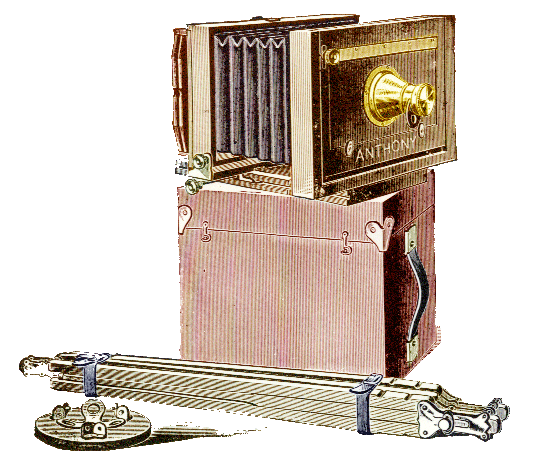 E. & H.T. Anthony Champion camera was manufactured from around 1890 to 1895. It was one of the more popular dry plate camera models. It was made of mahogany with fine varnish finish. the camera housed a rear folding bed that was held in place with Anthony's patent clamps. Additional features included a rising front and ability to adapt for vertical or horizontal pictures. A distinctive cone shaped, single achromatic brass lens suited for landscape came with the outfit. In addition, a wooden carrying case and tripod came with the outfit. Sizes ranged from 4x5 to 8x10 and prices from $10 to $20 dollars.