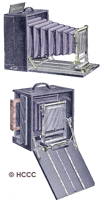 The Marlboro Camera was manufactured by E. & H.T. Anthony company from approximately 1896 to 1900. It was the first hand camera with a reversible self adjusting spring back. This improvement alone makes it the superior of any other camera on the market. The Marlborough was fitted with rising and falling front, swing front rack and the finest adjustment pinion movement, and swing back. It was constructed with leather covering of the best quality. The bellows was of the highest grade leather and the interior of the camera has an ebony finish. Fitted with a rapid rectilinear lens. This camera accommodated both plates and films. Another feature considered wide angle lenses, as it is obvious that the baseboard of the camera might be included in the angle of view of the lens, and to obviate this the baseboard is constructed so that it will fall and be at such an angle as to afford an entirely unobstructed view To drop the baseboard. The Marlborough Camera was made in three sizes 8 x 10, 6 1/2 x 8 1/2 and 5x7