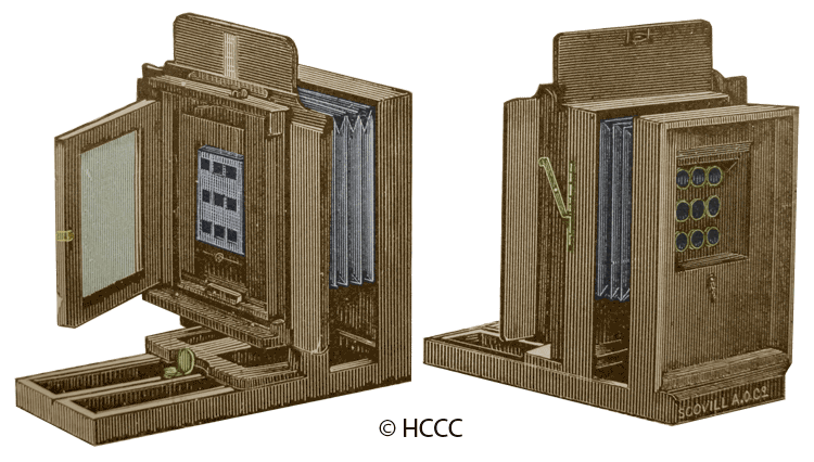 The Multiplying Camera was manufactured by the American Optical Company beginning in the early 1870s and has evolved over the some thirty years that it was produced. The model depicted in the illustration is from the late 1880s. Constructed of fine mahogany and supplied with nine gem tubes. The camera was capable of making seventy two, thirty six and eighteen gems on a 7 x 10 plate. The lens arrangement could be changed to achieve numerous sizes including Imperial, Victoria, Cabinet sized cards. priced at $100.