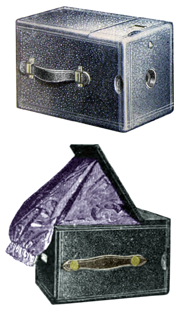 The Vive no. 1, or the $5.00 dollar Vive, was manufactured from 1896 to 1902. Advertised as being able to take the largest picture, 4 1/4 x 4 1/4 inches, of any other $5.00 camera on the market. It was designed with a dark sleeve to change plates in the camera. I contained 12 metal combination glass plate and cut film holders that were capable of holding up to 24 S.R.V. backed glass plates or up to 72 S.R.V. backed cut films. It was covered with fine seal grain black leather, metal fittings finished in black. Fitted with a universal tripod socket, large brilliant square finder and an improved shutter for instant and time pictures. The outside dimension measured 4 7/8 x 5 1/8 x 7 7/8 inches.