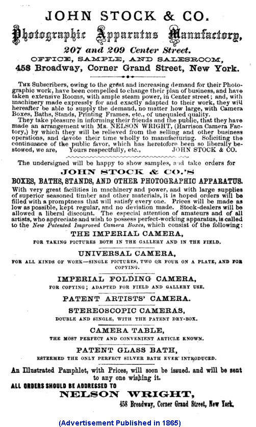The following distinct cameras are identified through an early advertisement of 1865. Some interpretation of camera model from reference material was necessary due to unclear errors in the referenced 1873 and 1879 books.