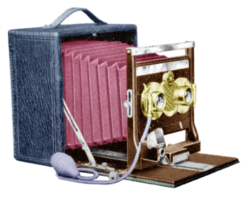 The Seneca Stereo Camera, Style B was manufactured by the Seneca Camera Manufacturing Company in circa 1909. The Design was based on general features to the Seneca No. 7 camera. It is equipped with the Seneca Duo Double Valve stereo shutter and a matched pair of Seneca Symmetrical lenses. This camera was made to take film pack adapters. The internal stereo division in these models is constructed on the roller blind principle unrolling or rolling automatically as the camera is opened or closed. The roller portion could be removed to allow the camera to use the camera for 5 x 7 inch pictures with the replacement of the lens and lens board with a single lens. Priced at $48.00.