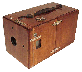 1888 George Eastman patents and markets The Kodak camera at a cost of $25 for the complete outfit. It came preloaded with Eastman Celluloid film good for 100 pictures. After the amateur takes the photos, they then send the whole camera back to eastman for processing. Eastman revolutionized the photography industry by putting the capability to take photos into the hands of amatuers. Shown here is the first improved version of the kodak or the no. 1 model of 1889.