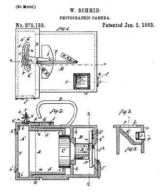 1883 William Schmid patents the first type of detective camera for dry plates. Pictured on the right is a more common Blair Camera Co. Detective camera c.1890