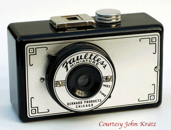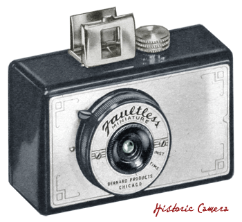 The Faultless Miniature Camera was manufactured by the Bernard Products Company of Chicago Illinois in circa 1947. Described as combining compactness of a candid camera with simplicity of operation. It was constructed of polished molded black plastic with an etched metal front plate. Featured a folding direct eye level finder and fixed focus Graf Meniscus lens for taking pictures from 8 feet to infinity. It housed a two speed shutter for instantaneous and timed exposures. It was capable of capturing sixteen exposures, 1 1/2 x 1 5/8 inches on standard no. 127 roll film. The camera measures 4 1/2 inches long x 2 1/2 inches wide x 1 3/4 inches deep. The camera was sold with an artificial leather carry case. Priced at $3.95.