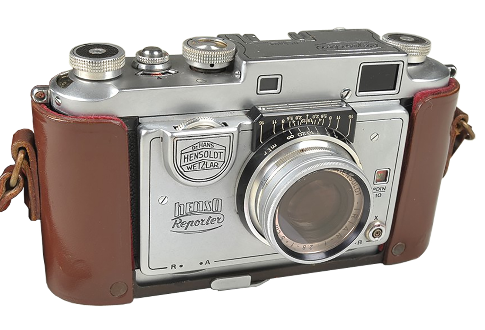 The Henso Reporter was sold by the Hensoldt & Sohne company of Wetzlar, Germany in circa 1953. The camera was manufactured by ISO in Italy. It was a well made 35mm rangefinder camera constructed of metal with leather covering. It was fitted with an Arion 1.9 lens or a Hensoldt Irair F2.8 lens and a focal plane shutter capable of speeds from 1 to 1/1000th of a second. The optics were interchangeable.