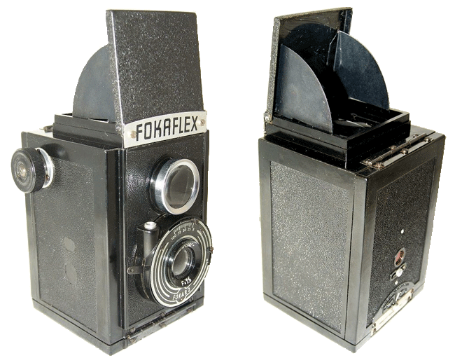 The Fokaflex was manufactured in Japan in circa 1955. McKeowns suggests that the manufacturer was likely Sanwa Photographic Supply. A simple twin-lens camera constructed of bakelite with a large top view finder. It was capable of capturing a 6 x 6 cm exposure on No. 120 roll film. It was fitted with a Fokar 2 f7.5 lens and variable shutter providing speeds of 1/25th to 1/100th of a second, plus bulb. The camera was produced in six versions with minor variations.