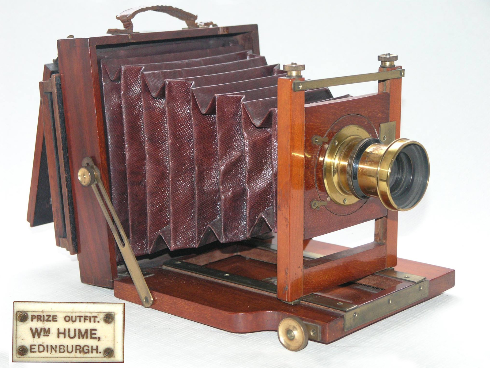 The Prize Outfit camera was manufactured and sold by William Hume in circa 1895. His manufacturing shop was located in Edinburgh, Scotland. The camera was constructed of finely hand-dovetailed mahogany wood with brass fittings. It featured rising and falling circular lens board of an unusual type, double extension burgundy bellows made out of leather. This camera was only made in the half plates size.