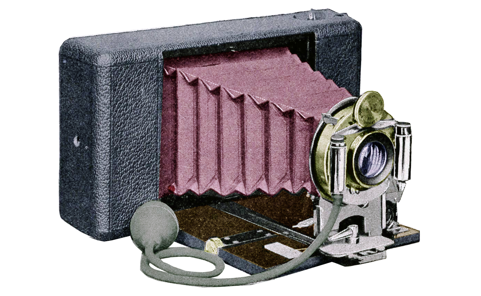 The No. 6 Folding Buck-eye Camera was manufactured by the American Camera Manufacturing Company of Rochester, New York in circa 1895 - 1908. The No. 6 folding buckeye camera was similar to the No. 5 folding buck-eye camera, except it captured larger 4 x 5 inch exposures on roll film. It was designed as a drop down single extension bellows with rack and pinion for focus adjustment. The camera was constructed of mahogany with leather covering and a red leather bellows. It featured a double combination extra rapid rectilinear lens with a focal lenght of 6 inches. It was mounted in a Baush & Lomb automatic shutter providing speeds of 1/100, 1/25, 1/5, 1/2 and 1 second, and also has time and bulb movements. Iris diaphragm stops provide 4, 8, 16, 32, 64 and 128. Other features include a rack and pinion for focusing, a reversible brilliant finder, two tripod sockets, focusing scale. It accepted daylight loading film cartridges for 2, 4, six or twelve exposures. It could be used as a plate camera with the Glass plate attachment. The No. 6 camera measures only 2" x 4 1/2" x 7 7/8" when closed and was priced at $18.00 in 1904.