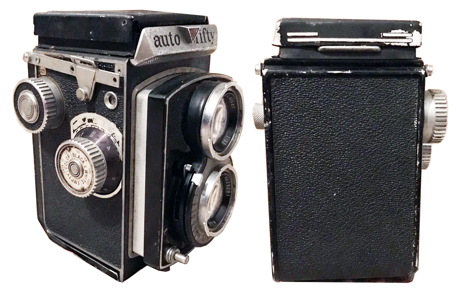 The Auto Fifty camera was designed, marketed and sold by the United States Camera Corp. of Chicago Ill in circa 1955. It was manufactured in Japan by the Taiyo-do company. It was a good quality Twin Lens reflex camera that captured 6x6cm exposures on standard no. 120 roll film. It was fitted with a f3.5 8cm Tri-Lausar viewing lens and Biokor photo lens, mounted in a variable speed Synchro MX shutter providing eight speeds ranging from 1 to 1/300 plus B. Other features included rack and pinion focusing, 7 aperature settings, synchronized flash, automatic film stop and an exposure counter.