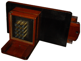 1854 Andre Adophe-Eugene Disderi patents the Cartes-de-visite system in France, using 8-12 lens photographing on one plate. A. A. Disderi standardizes photograph size mounted on card stock 2 3/8" x 4 1/4". Shown here is a later carte-de-visite camera from the American Scovill Company. |