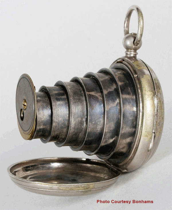 The Watch Camera was manufactured by J. Lancaster & Son of Birmingham, from 1886 to 1900. It was patented on October 4th, 1886 patent no. 12571. It was constructed of engine turned metal with nickel plating. Designed to look like a pocket watch and easily carried in a waistcoat pocket. It was a self erecting camera which expanded six spring-loaded telescoping tubes when opened to form the bellows of the camera. It featured an internal meniscus lens and a simple rotary shutter in early models or a drop shutter in later.