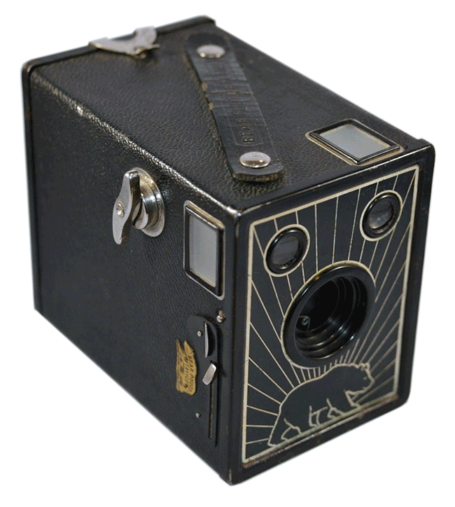 The Bear Photo Special Camera was sold by the Bear Photo Company of San Francisco, California, but manufactured by Ansco. This camera was the only camera to bare their name (no pun intended). The company mainly sold photograph postcards, some with hand coloring. The Bear Photo Special camera was a simple box camera constructed of all pressed meta with a distinctive faceplate depicting sun rays and a bear. It provided a time and instantaneous shutter with a fixed focus lens.